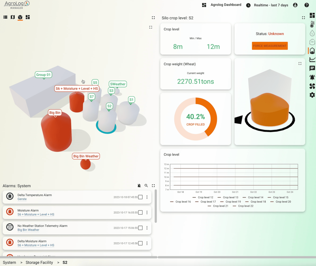 • AgroLog Manager відображає рівень, поверхню, об’єм та масу зерна, забезпечуючи оновлення даних у реальному часі та точний облік запасів