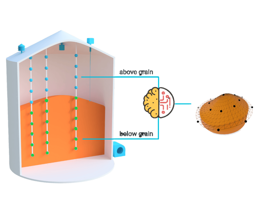 • Дані температурних датчиків використовуються для визначення того, які датчики знаходяться в зерні, а які – поза ним, із застосуванням просунутого AI-алгоритму