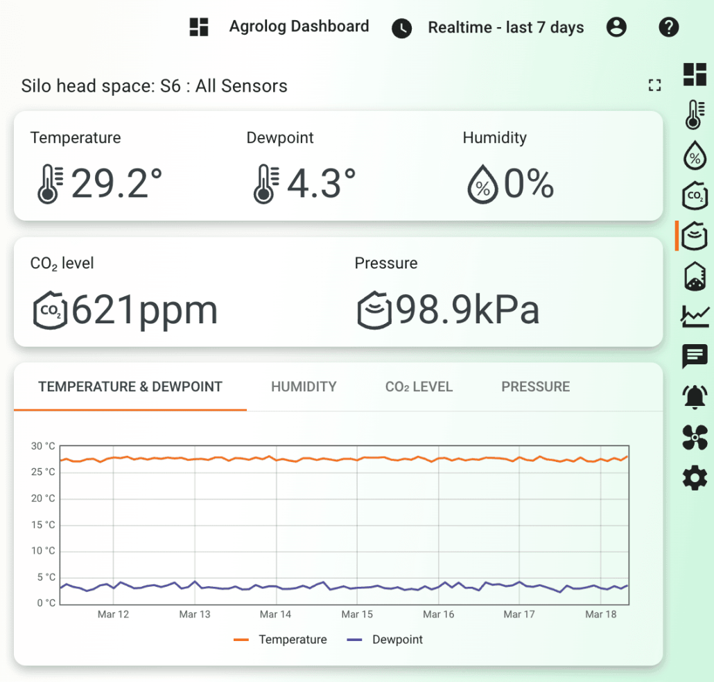 Датчики предназначены для контроля: CO₂, температуры и влажности, предотвращение конденсата и раннее выявление порчи зерна при хранении.