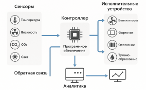 Контроллеры работают круглосуточно, синхронизируясь с внешними погодными источниками и внутренними датчиками, что превращает теплицу в самообучающуюся систему.