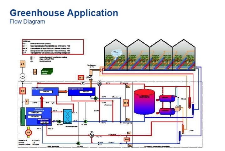 Когенерационная установка для отопления теплицы дает три ресурса из одного топлива (обычно природный газ/СПГ/биогаз): электроэнергию для досвета и хозяйственных нужд, горячую воду для отопительных контуров и пищевой CO₂ для ассимиляции.